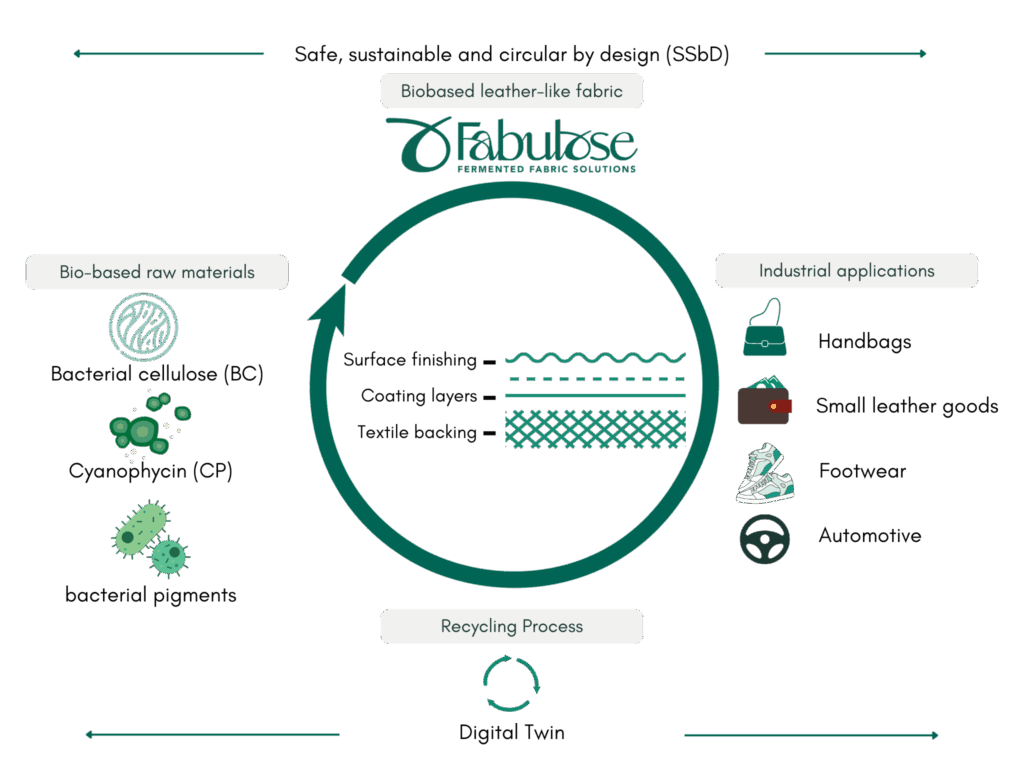 are based on bacterial cellulose and cyanophycin, produced using CO₂ emissions and food-industry side streams. Through advanced fermentation, AI-driven process optimisation, and innovative coating and finishing techniques, we deliver sustainable solutions for the future of fashion and beyond.